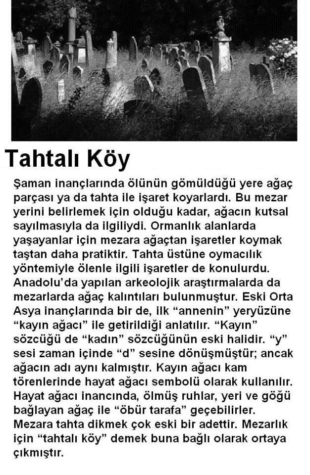 Günümüzde ölümleri veya öbür tarafa gitmeyi anlatırken kullanılan "Tahtalı köy" ifadesi buradan gelmektedir..