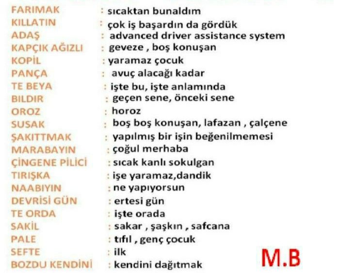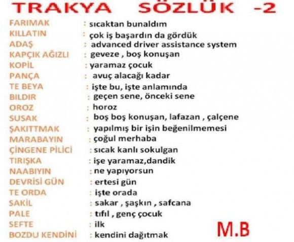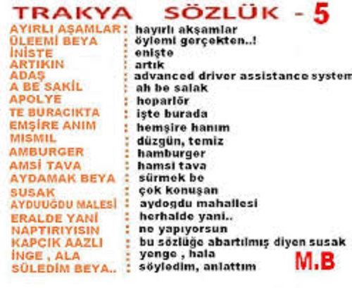Motor: Trakyada traktör anlamında kullanılır, başka yerlerde olduğu gibi motosiklet değil. Örn: Bu kızan çok fena motor aydüyü beya! (Çocuk çok tehlikeli ve hızlı traktör kullanıyor.)