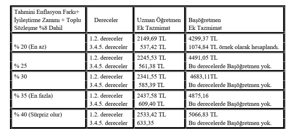 Aşağıdaki tabloda öğretmenlerin derecelerine göre maaşları yer almaktadır.