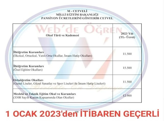 2023 Yılı pansiyon ücretlerini gösteren cetvel yayınlandı. Okul türüne göre pansiyon ücretlerini gösteren cetvel? 2022 m cetveli İlköğretim Kurumları (İlkokul,Ortaokul, Yatılı Orta Okullar, İmam Hatip Okulları )