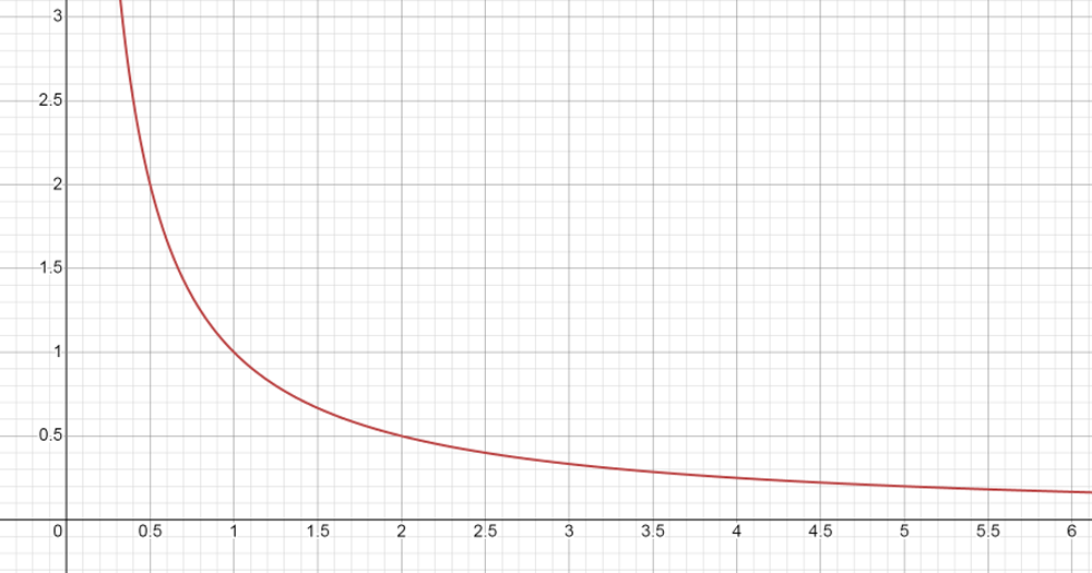 X değeri arttıkça Y değeri küçülür ve X sonsuza yaklaştıkça, Y değeri de sıfıra yaklaşır. Limit işlemi, bu yaklaşılan değeri sonuç olarak kabul eder. Yani fonksiyonun x=∞ için limiti sıfırdır. Fonksiyonumuzun grafiği aşağıdaki gibi görünür. (X ne kadar artarsa, Y o kadar sıfıra yaklaşır.)