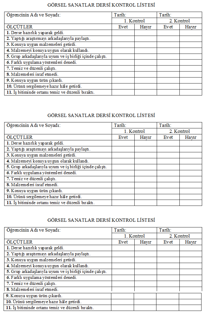 Görsel Sanatlar Dersi İçin Kontrol Listesi GÖRSEL SANATLAR DERSİ İÇİN KONTROL LİSTESİ 01 Ocak 2023 Pazar 20:57 Öğretmen haberleri ve gelişmelerden hemen haberdar olmak için Telegram kanalımıza katılın!
