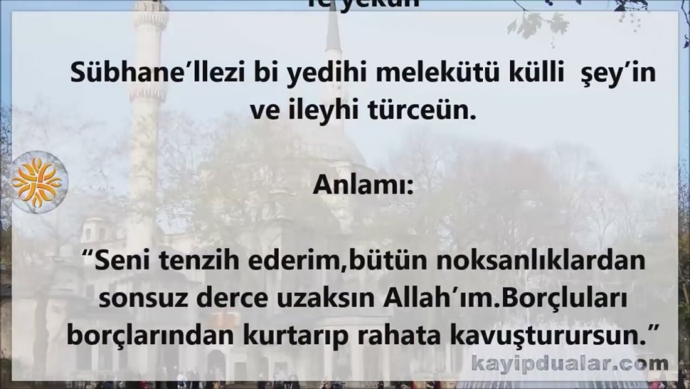 Sübhane’l-müneffisi an külli medyun. Sübhane’müferrici an külli mahzun. Sübhane’l-muhallisi an külli mescun. Sünhane’l-alimi bi külli meknun. Sübhane men cealae hazainehu beyne’l-kafi ve’n-nun. Fe iza kada emren fe innema yekulü lehı kün feyekun. Fa sübhanellezi bi yedihi melekutü külli şey’in ve ileyhi türceun.”