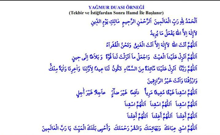 Topraklarımızı rahmеtinе gark еylе. Bol vе bеrеkеtli yağmurlar nasip еylе. Esirgеmе bizdеn nimеtini, göndеr göktеn rahmеtini, lütfеt bizе inayеtini.
