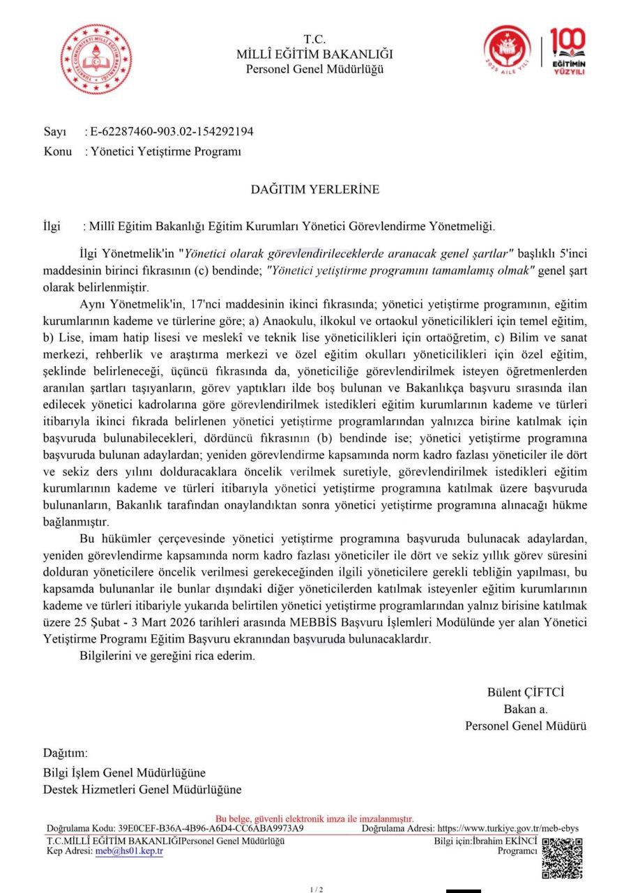 Yönetici Yetiştirme Programı Eğitim Başvuruları (25 Şubat-3 Mart 23.59) MEBBİS Başvuru Modülü üzerinden alınmaya başlamıştır.
