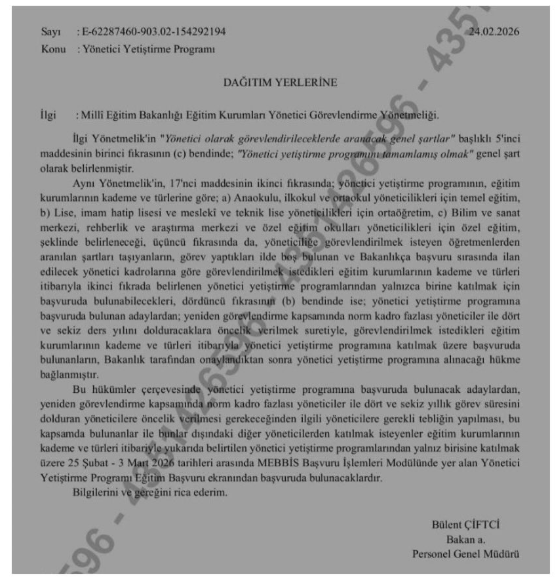 Bu hükümler çerçevesinde yönetici yetiştirme programına başvuruda bulunacak adaylardan, yeniden görevlendirme kapsamında norm kadro fazlası yöneticiler ile dört ve sekiz yıllık görev süresini dolduran yöneticilere öncelik verilmesi gerekeceğinden ilgili yöneticilere gerekli tebliğin yapılması, bu kapsamda bulunanlar ile bunlar dışındaki diğer yöneticilerden katılmak isteyenler eğitim kurumlarının kademe ve türleri itibariyle yukarıda belirtilen yönetici yetiştirme programlarından yalnız birisine katılmak üzere 25 Şubat -3 Mart 2026 tarihleri arasında MEBBİS Başvuru İşlemleri Modülünde yer alan Yönetici Yetiştirme Programı Eğitim Başvuru ekranından başvuruda bulunacaklardır.