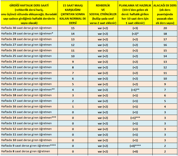 Haberimizin içeriğinde ek ders hesaplama tablosu yer almaktadır. Tabloda yer alan bilgilere göre, ek derslerle iligili kafalara takılan tüm sorular yanıt bulmaktadır.