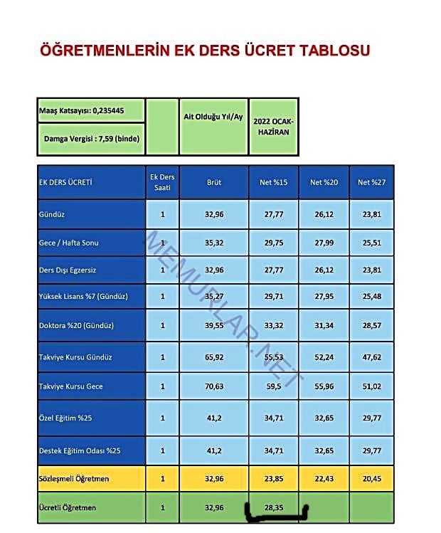 Not: Özel eğitim alanında görev yapan ücretli öğretmenlere %25 artırımlı ek ders ücreti ödenmemekte. Bu arkadaşların hesaplamalarını yaparken normal ek ders ücreti üzerinden yapmaları gereklidir.