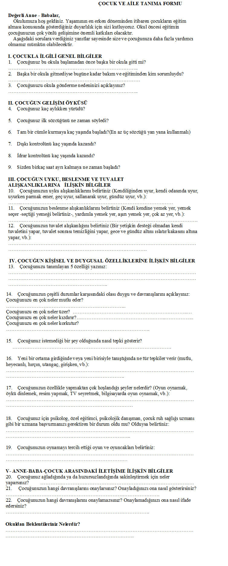 ÇOCUK VE AİLE TANIMA FORMU