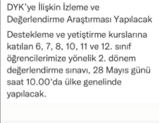 Milli Eğitim Bakanlığı DYK'ya ilişkin tüm sınıflarda, izleme ve araştırma değerlendirmesi yapmayı planlıyor.