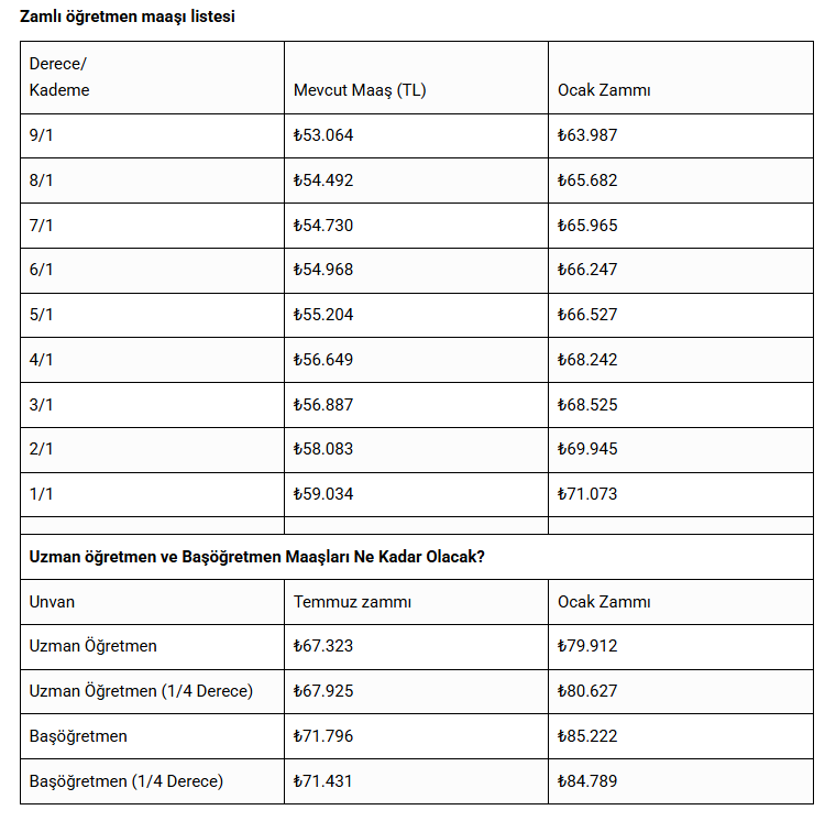 Bu durumda öğretmenlerin maaşlarına %7,7 oranında enflasyon farkı zammı yansıtılacak. %11’lik toplu sözleşme zammı ile beraber Ocak ayında yapılacak olan toplam zam oranı ise %18,7 olacak. Ayrıca toplu sözleşme görüşmeleri gereği alınan karar neticesinde öğretmen maaşlarına 1.000 TL taban aylık zammı yapılacak. Tüm bu hesaplamalar neticesinde öğretmenlerin Ocak ayında alacakları zamlı Maaşlar derecelerinde ve unvanlarına göre yeniden hesaplanmıştır.