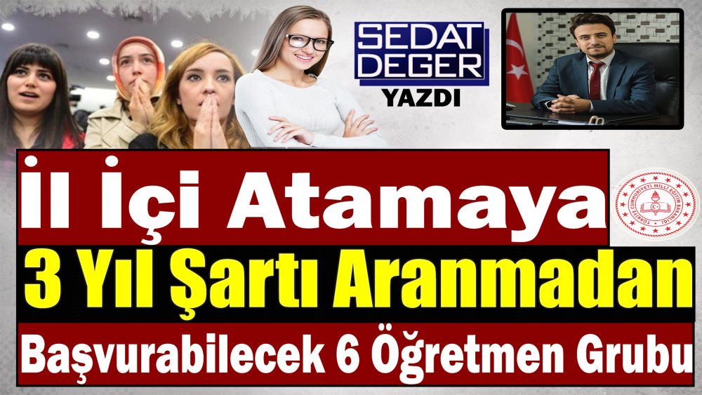 Milli Eğitim Bakanlığımız, Öğretmenlerin İl İçi İsteğe Bağlı Yer Değiştirme Atama takvimini yayınladı. İl İçi atama dönemine girilirken öğretmenlerin özellikle merak ettiği konulardan birisi de “hangi öğretmenlerin 3 yıl şartı aranmaksızın il içi atama isteğinde bulunabilecekleri” oluyor . Eğitimci yazar Sedat DEĞER bu konudaki merakı gidermek adına geçmiş tecrübeleri ve mevzuat bilgisiyle örnekleriyle açıklayarak 3 yıl şartı aranmaksızın başvuru yapabilecek 6 öğretmen grubunu yazdı.