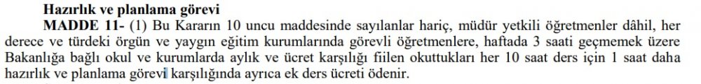 10 saate 1 hazırlık ve planlama ek ders ücretinin ödenmesini düzenleyen bu maddedeki “…aylık ve ücret karşılığı fiilen okuttukları her 10 saat ders için 1 saat daha hazırlık ve planlama görevi karşılığında ayrıca ek ders ücreti ödenir” hükmü gereği haftalık maaş karşılığı derslerini doldursun ya da doldurmasın öğretmenlere fiilen okuttukları her 10 saat ders için 1 saat daha hazırlık ve planlama görevi karşılığında ayrıca ek ders ücreti ödenir.