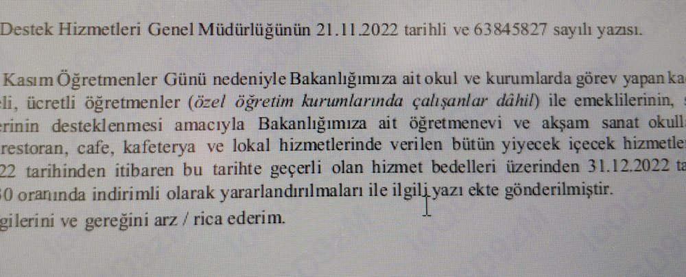 Öğretmenler Günü Nedeniyle Öğretmenevleri ve Lokantaları Yüzde 30 İndirimli? Öğretmenler Günü nedeniyle 21 Kasım- 31 Aralık 2022 tarihleri arasında öğretmen evlerinde lokal ve lokantada öğretmenlere %30 indirim yapılacak. 22 Kasım 2022 Salı 12:01 Öğretmen haberleri ve gelişmelerden hemen haberdar olmak için Telegram kanalımıza katılın!
