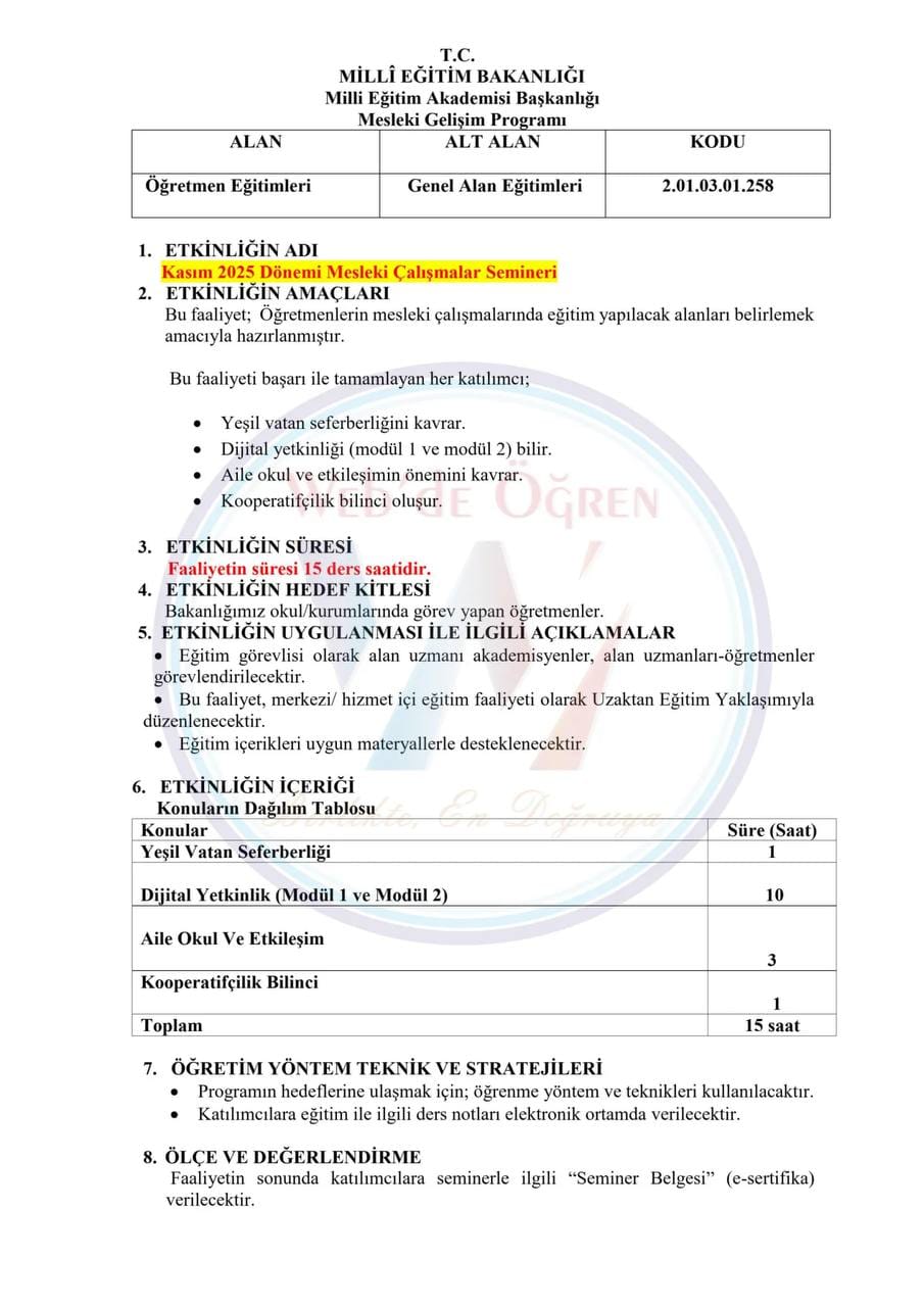 MEB 10–14 Kasım 2025 tarihleri arasında gerçekleştirilecek olan Kasım Ara Tatil Mesleki Çalışma (Seminer) Programı’nın ayrıntılarını duyurdu.