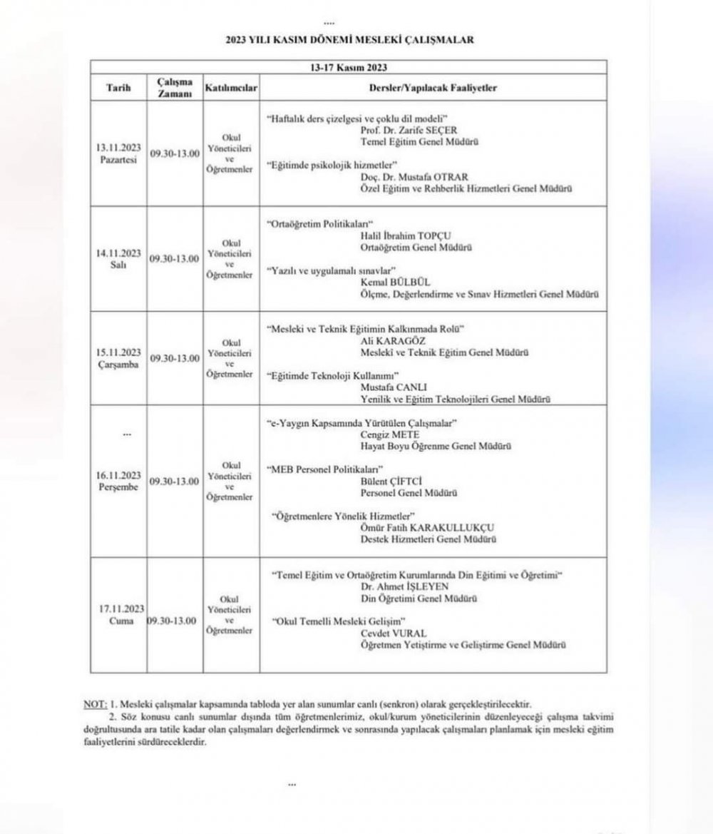2. Söz konusu canlı sunumlar dışında tüm öğretmenlerimiz, okul/kurum yöneticilerinin düzenleyeceği çalışma takvimi doğrultusunda ara tatile kadar olan çalışmaları değerlendirmek ve sonrasında yapılacak çalışmaları planlamak için mesleki eğitim faaliyetlerini sürdüreceklerdir