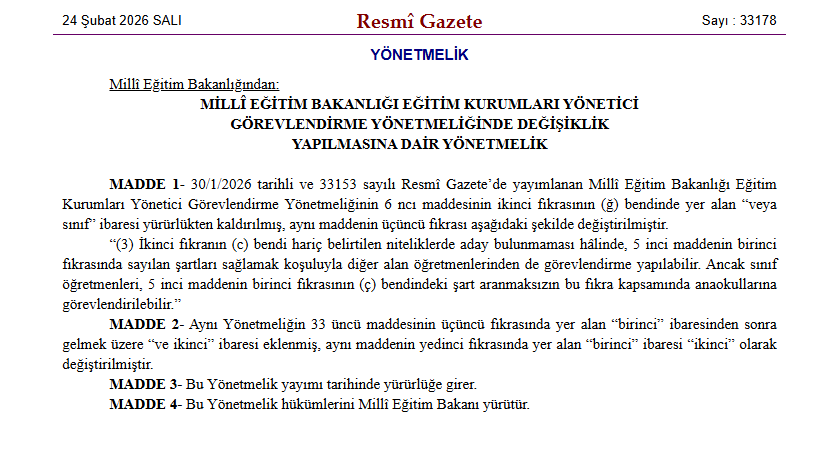 MEB Yönetici Görevlendirme Yönetmeliğinde değişiklik yapıldı.